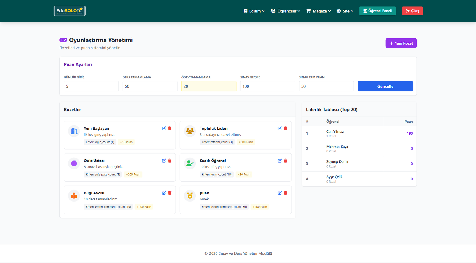 Öğrencilerin ilgisini canlı tutun. Puan sistemi, rozetler ve detaylı karne analizi.