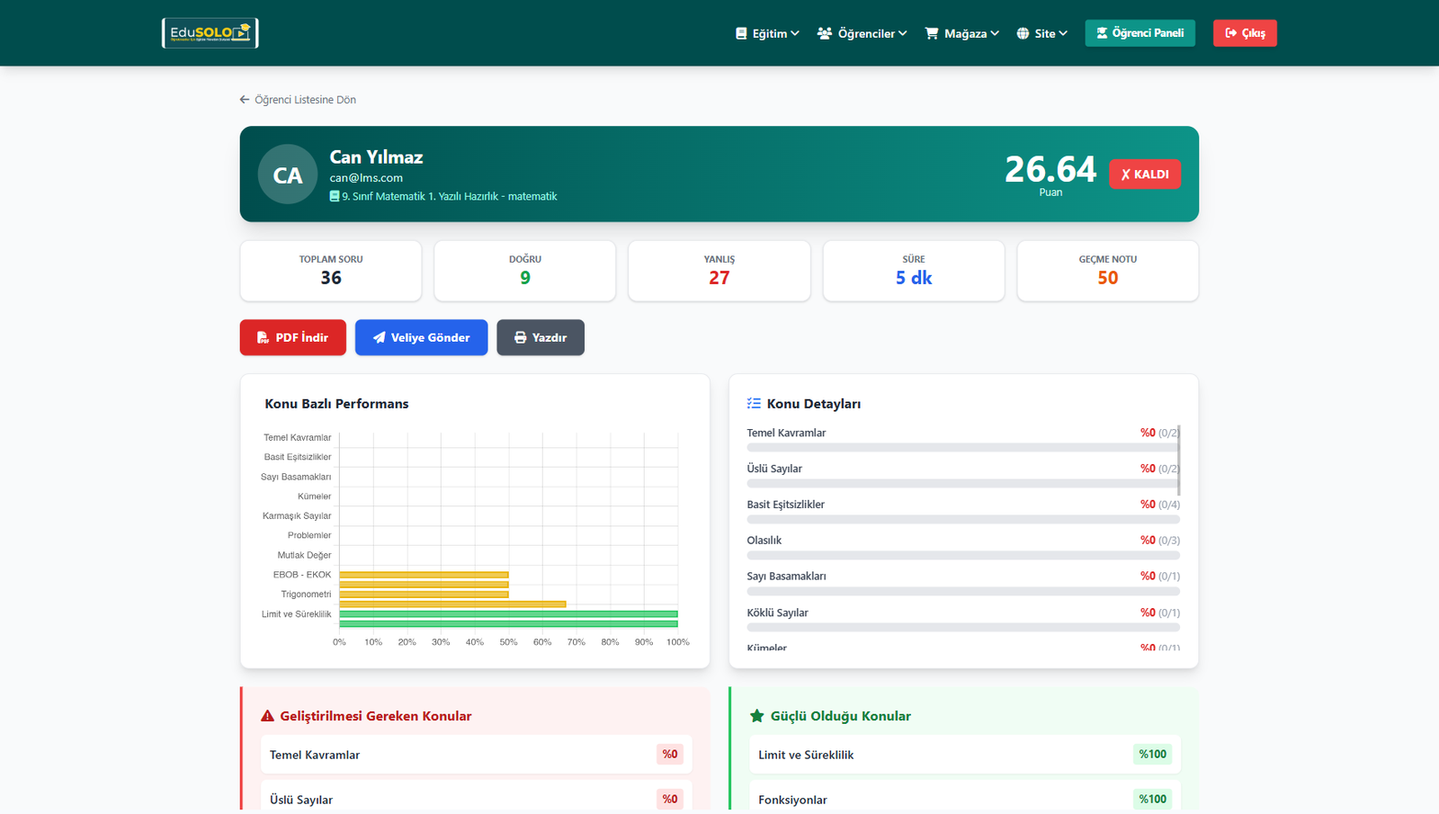 Eğitim sadece sınıfta bitmez. Öğrencinizin hangi videoyu ne kadar izlediğini, girdiği denemelerdeki netlerini ve eksik konularını içeren profesyonel bir PDF raporu oluşturun.